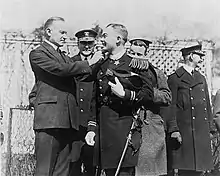 Ryan was a 1921 graduate of the United States Naval Academy at Annapolis, Maryland. While an ensign, he was in Yokohama, Japan during the 1923 Great Kantō earthquake, during which he saved a woman, Mrs. Slack, from the burning Grand Hotel.[1] This action earned Ryan the Medal of Honor, making him one of 18 men to receive the Medal of Honor during the interwar period from 1920–1940.[2] Ryan was presented the Medal of Honor by President Calvin Coolidge at the White House on March 15, 1924.