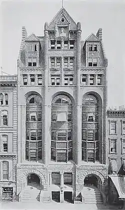The ground floor, which was built of rusticated sandstone from Gatelawbridge, Scotland,[1] featured two large, recessed Roman archways, one on each wing, which served as the main entrances. The upper stories of the facade were constructed of moulded brick and terra cotta.[1] At the top of the building was an "enormous" bust of Thomas Jefferson, set in an alcove.[6][8]