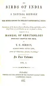 Jerdon's most important publication was The Birds of India (1862–64), which included over 1008 species[10] in two volumes with the second volume in two parts. This work was dedicated to Lord Canning and Lord Elgin who supported the venture.
