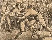 King's next fight was a defence of the English heavyweight championship and took place on a sunny morning at 10 am on 10 December 1863[14] for the exceptional sum of £1000 a side against John C Heenan. Heenan was an American who had fought the British boxer Thomas Sayers to a controversial draw for the heavyweight title in 1860. Heenan had been unofficially acclaimed the heavyweight champion, so King and his seconds knew the importance of taking the bout to defend the title. Thomas Sayers acted as Heenan's second, appearing in a boxing ring for the last time before his early death in 1865.[15] The bout was held at Cockmounts Farm, Wadhurst, East Sussex and was fought with bare-knuckles using London Prize Ring Rules.[16] According to Heenan's 19th-century biographer, the fight lasted 35 minutes and 25 rounds. In the first round, Heenan put King in a headlock and beat his head with his opposite hand until forced to stop from the blows administered by King on his back. Called "fibbing" at the time, holding an opponent by the neck and striking him was a move usually allowed under London Prize Ring Rules. In the second, Heenan again tried to hug and strike King but with less success, so he threw King to the ground. Heenan attempted a hold again in the third and threw King into the ropes, throwing him to the ground with force in the sixth. In the sixteenth, King was again dashed to the ground, thrown by Heenan. For the first 17 rounds the fighting appeared close with a lead by Heenan, but in the 18th round King seemed to gain the advantage with blows to Heenan's face, and went on to win the match. King dominated the last three rounds, and Heenan's face was pummeled brutally, showing considerable injury. In the 23rd, King downed Heenan with a right. Heenan came to scratch in the 24th, but was downed again near his corner by King, curling up in a heap. He was unable to answer in the 25th and when his second "threw up the sponge", the fight was called. Heenan received dreadful injuries to his face, and several reporters present at the fight felt it should have been called in the 21st.[3][17][18][19]