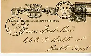 In 1875 Thomas Leavitt and his brother Martin were issued United States Patent Number 175,290 for a device which would allow different sizes of letters to have their postage stamps cancelled.[3] The two brothers tested their hand-cranked, hand-fed device at the main Boston Post Office under the watchful eye of postal workers. The device was largely a failure. But after more tinkering, Leavitt and his brother got a second patent (Number 192,519). The Leavitt brothers' second device is considered the first practical device in the U.S. for mechanized cancelling.[4]