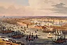 Thomas Rainsborough was born on 6 July 1610 in Wapping, close to the Port of London, eldest son of William Rainsborough (1587–1642). A wealthy merchant and member of the Levant Company, in 1637 William was offered but refused a baronetcy for his help in negotiating a peace treaty with Morocco.[3] Thomas' mother had another two children before she died sometime before 1624, William Rainsborowe [sic] (1612–1673), and Martha (1617–1660). He also had three surviving half-siblings from his father's second marriage to Judith Hoxton (died 1638); Judith, Joan and Edward (1639–after 1673).[3]
