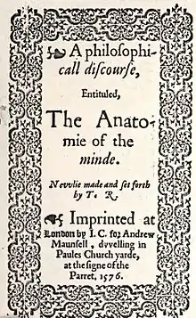 - A Philosophical Discourse, entituled the Anatomie of the Minde. London. 1576. This is a work on the passions from a largely Aristotelian point of view.[5] The front matter includes an epigram from William Camden, a poem by Abraham Fowler, and other poetry by Josua Hutten and Justinian Baldwin.