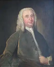 He died on 9 January 1747/48, aged 68.[7] "A stone of eight ounces and one dram was found in his kidneys".[8] His mural monument survives in Broadhembury Church, Devon, erected by his daughter Mrs Drewe. It displays at top the canting arms of Rose: Sable, on a pale or three roses gules slipt and leaved proper; Crest at top: A rose slipped and leaved; bottom: Drewe (Ermine, a lion passant gules) impaling Rose. It is inscribed as follows: