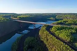 The Thomas Rukavina Memorial Bridge carries U.S. 53 over the Rouchleau Mine pit connecting Virginia, Minnesota with other cities to the south. U.S. 53 continues through Virginia to International Falls and Canada; International Falls is about 100 miles (160 km) north of Virginia. The bridge, opened in 2017, was named after Tom Rukavina in 2021 following his death in 2019. Rukavina was a state legislator from the Iron Range.[1][2] At 204 feet (62 m) tall, it is the tallest bridge in Minnesota.[3] This bridge carries a traffic volume of about 22,200[4] cars per day, making it one of the most-traveled highway segments on the Iron Range. The bridge also features a bike lane and pedestrian walkway that leads to trails connecting Gilbert and Virginia. The Mesabi Trail crosses the bridge.[5]