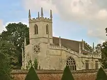 - Doddington Church, near Lincoln. Rebuilt 1770-5. A Remarkable early example of a Gothic Revival Church. The detailing of the entrance door is more in the style of Strawberry Hill Gothic with lushly foliated crocheted and ogee decorated gables. The two west end windows are an interesting adaptation of the Lincolnshire flamboyant tracery of the decorated period of Church architecture.[11]