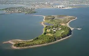 The island has a size of 170 acres (0.69 km2), and the highest point is a drumlin that reaches a height of 78 feet above sea level. The rest of the island comprises low rolling hills and a salt marsh. The island has a mixed vegetation, including hardwood tree stands, remnant pear and apple orchards, ornamental trees and shrubs, and salt marsh grasses. The island has open meadows, forests, marine wetlands, sumac groves, and a variety of other geological features as well. Amenities include a formal school campus complete with classrooms, dormitories, dining hall, auditoriums, gymnasium, lab space, outdoor challenge courses, and climbing towers.[1] At low tide, a sandbar connects it to Squaw Rock on the Squantum peninsula, allowing land travel between the two.