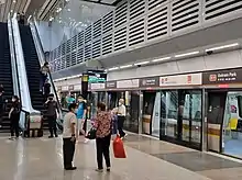 Station codes for the line are brown, corresponding to the line's colour on the system map. Most stations are island stations, with the exception of Napier,[48] Maxwell,[49] Shenton Way and Marina Bay stations,[50][51] which have stacked side platforms. Future stations Katong Park and Tanjong Katong are planned to also have stacked side platforms,[52][53] and Tanjong Rhu station is planned to have side platforms.[54]
