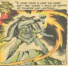 - Thor and Dynamite Thor: The Golden Age anthology Weird Comics by the Fox Feature Syndicate featured two characters named Thor. The first, seen in issues #1-5, is a mortal man given strange lightning powers by the Norse God.[7] Grant Ferrell was chosen by the real Thor, looking down at humanity from his perch in Valhalla. Thor decided to bestow powers on a mortal, and spied Grant, a meek man who lost his girlfriend Glenda at a nightclub. Thor picked Grant up and brought him to Valhalla, where he was trained in using the powers of lightning and Mjolnir, Thor's magic hammer. Grant returns to Earth dressed in a revealing costume — just trunks, a cape and a helmet. He rescues Glenda from a group of spies, and decides to devote his life to heroic deeds.[7] He goes on to fight spies and Germans.[8] That character lasted for five issues, and was then rebooted in issue #6 as a new character, Peter "Dynamite" Thor, with different powers, but the same girlfriend.[9] Dynamite Thor was a demolitions expert who was immune to the effect of explosives. He used dynamite to propel himself through the air.[10] He used his abilities to fight spies, mad scientists and the devious War Maniac.[8] Dynamite Thor appeared in Weird Comics #6 and 7, and then moved to Blue Beetle #6-8.[7]