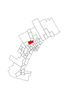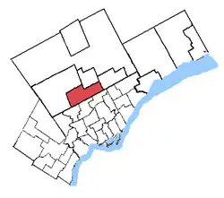 The riding is named after Thornhill, a suburban neighbourhood founded as a rural community that was first settled along Yonge Street in the mid-1790s, around the time of the street's opening.[3] The district of Concord and Vaughan Metropolitan Centre occupies the northern and western parts of the riding.[4]