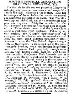 That season, the club also reached the Scottish Cup final. After two easy ties, the club struggled to a 1–0 win over Barrhead Rangers,[7] with a breakaway goal five minutes from time.[8] In the fourth round, the club hammered Possilpark F.C. by a score given as 12–0[9] or 13–0;[10] the Rutherglen Reformer noting that "they had nothing to do but score, and they did it". The club also put 12 past Rob Roy of Callander in the fifth round before meeting the 3rd Lanarkshire R.V. in a tie that Thornliebank was not expected to win. After the original tie at Deacon's Bank ended in a draw, and a hurricane-force storm prevented extra-time,[11] the replay took place at Copeland Park in Govan, the home of South Western F.C., as the Thirds' regular Cathkin Park ground was being used for Scottish FA trial matches.[12] The Thirds thought they had opened the scoring, but the goal was disallowed as they had already claimed for a foul, which was instead given; after 90 minutes, the score was 1–1, so the clubs played an extra 20 minutes. Thornliebank won the game with "a capital shot by Wham, 35 yards off". It was noted that the Thirds were unable to play their usual passing game because of the pressing of Thornliebank, so resorted to long balls, charging, and scrimmaging, which was more Thornliebank's style.[13]