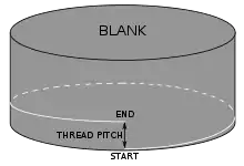 Single-point threading, also colloquially called single-pointing (or just thread cutting when the context is implicit), is an operation that uses a single-point tool to produce a thread form on a cylinder or cone. The tool moves linearly while the precise rotation of the workpiece determines the lead of the thread. The process can be done to create external or internal threads (male or female). In external thread cutting, the piece can either be held in a chuck or mounted between two centers. With internal thread cutting, the piece is held in a chuck. The tool moves across the piece linearly, taking chips off the workpiece with each pass. Usually 5 to 7 light cuts create the correct depth of the thread.[6]