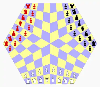 Three-man chess is a chess variant for three players invented by George R. Dekle Sr. in 1984.[1][2] The game is played on a hexagonal board comprising 96 quadrilateral cells. Each player controls a standard army of chess pieces.
