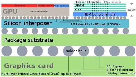 Cut through a graphics card that uses High Bandwidth Memory (HBM), based on through-silicon via (TSV) 3D IC technology.