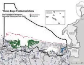 The Three Bays Protected Area has a boundary perimeter of approximately 170 km (110 mi) encompassing over 75,000 ha (190,000 acres). It is the second largest declared protected area in Haiti after the Port Salut/Aquin Protected Area (Aire Protégée de Ressources Naturelles Gérées de Port Salut/Aquin).