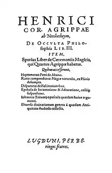 Three Books of Occult Philosophy (De Occulta Philosophia libri III) is Heinrich Cornelius Agrippa's study of occult philosophy, acknowledged as a significant contribution to the Renaissance philosophical discussion concerning the powers of magic, and its relationship with religion. The first book was printed in 1531 in Paris, Cologne, and Antwerp, while the full three volumes first appeared in Cologne in 1533.[1]