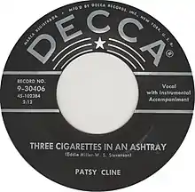 "Three Cigarettes in an Ashtray" was released as a single on August 12, 1957 via Decca Records. It was backed by the B-side, "A Stranger in My Arms."[4] It was Cline's fourth single release with the Decca label, which Four Star leased.[5] The song was also included on Cline's self-titled debut album, which was also issued in 1957 through Decca.[6] Shortly after the single's release, Cline promoted the track by performing on the nationally syndicated television program, Ozark Jubilee. A full-page advertisement was also included in Billboard magazine the same month which read, "The 'Walkin' After Midnight' Gal has 2 New Smash Songs!" Despite promotion, the single was not received well by disc jockeys and the record-buying public, therefore it was not successful.[7]