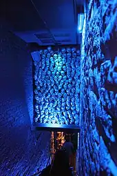 The bar has a discreet alleyway entrance, off of Hubbard Street in the River North district of Chicago. The entrance is sometimes given away by a red-roped line of people waiting to enter.[4] Inside the building, a set of stairs leads to the bar space. The staircase is heavily decorated, with a blue wall of skulls paired with drum music. The bar itself is island-themed, and evokes elements of the 1940s. Its main room includes 15 booths, 7 tables, and a bar with 18 stools. Its capacity is 240 people. The bar also includes a service bar.[2] The interior decor is tiki-style, including a fake thatched roof, colorful lighting, and ceramic tiki mugs.[5] Owner Paul McGee has his likeness on swizzle sticks in the bar, as well as in a cartoon image on the back of the menu.[2]