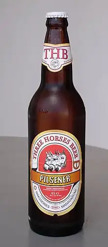 Three Horses Beer (better known locally as THB) is a pale lager that has been brewed by Star Breweries of Madagascar since 1958. It is the highest selling beer in Madagascar and has been described as emblematic of the country. THB is sold nationwide and since 2005 has been exported to such markets as France, Reunion Island, Comoros and Mayotte. The Malagasy beer is produced at two breweries in Madagascar, the first centrally located in Antsirabe and the other in the northern city of Antsiranana. THB Pilsener, the most common variant of THB, has a light taste and is produced from mostly local barley, corn and hops. Star Breweries also produces THB Fresh (a shandy with less than 1% alcohol), THB Special (6.2% alcohol), and THB Lite (1% alcohol). Recent investments in Star Brewery infrastructure have allowed a 20% increase in production since 2011.