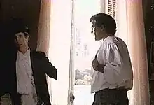 The figure is actually a cardboard cutout "standee" of Jack, wearing a tuxedo and top hat, that was left on the set. It was created as part of the storyline, in which he, an actor, appears in a dog food commercial, but this portion was cut from the final version of the film. The standee does show up later in the film, when Jack stands next to it as Sylvia comes to reclaim Mary. Snopes.com contends that the one in the first scene looks smaller than it does in the later scene because of the distance and angle of the shot, and because the curtains obscure its outstretched arms. As for the contention that a boy died in the house, all the indoor scenes were shot on a Toronto sound stage, and no kind of residential dwellings were used for interior filming.[7][8]