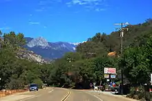 A 2010 view of Three Rivers from California State Route 198, looking northeast toward Sequoia National Park. The monolith looming in the left background is Moro Rock.