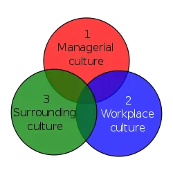 Managerial culture is the values of the management, and its norms, practices and artifacts. The workplace culture is the work and behavior norms as perceived by the workers point of view. The surrounding culture stands for the local norms and practices which characterize a national culture/ religious culture etc.[1]