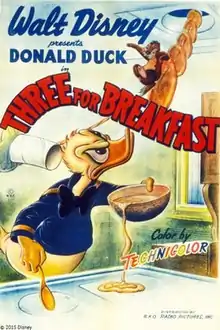Three for Breakfast is a 1948 American animated short film directed by Jack Hannah. Part of the Donald Duck film series, the film was produced in Technicolor by Walt Disney Productions and released to theaters by RKO Radio Pictures on November 5, 1948.[2]