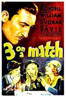 Three on a Match is a 1932 American pre-Code crime drama released by Warner Bros. The film was directed by Mervyn LeRoy and stars Joan Blondell, Warren William, Ann Dvorak and Bette Davis. The film also features Lyle Talbot, Humphrey Bogart, Allen Jenkins and Edward Arnold.[1]