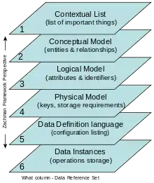One further development is the IDEF1X information modeling methodology, which is based on the three-schema concept. Another is the Zachman Framework, proposed by John Zachman in 1987 and developed ever since in the field of Enterprise Architecture. In this framework, the three-schema model has evolved into a layer of six perspectives. In other Enterprise Architecture frameworks some kind of view model is incorporated.