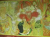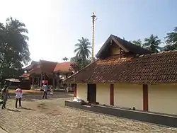 Between the entrance of Nallambalam to the sanctum, there is a raised square platform called Namaskara Mandapa (altar) which has a pyramidal roof. Thevrapura, the kitchen used to cook offering to the deity is located on the left of Namaskara Mandapa from the entrance. Balithara is an altar is used for making ritualistic offering to demi-gods and the festive deities. The sanctum called Sreekovil, houses the image of the presiding deity. It is on an elevated platform with a single door reached through a flight of five steps. Either sides of the doors have images of guardian deities called Dvarapalakas. As per Kerala rituals, only the main priest called Thantri and the second priest called Melshanthi alone can enter the Sree Kovil.[5] The central shrine has a circular plan with the base built of granite, superstructure built of laterite and conical roof made of terracotta tile supported from inside by a wooden structure. The lower half of Sree Kovil consists of the basement, the pillar or the wall, called stambha or bhithi and the entablature called prasthara in the ratio 1:2:1, in height. Similarly the upper half is divided into the neck called griva, the roof tower called shikhara and the finial kalasam (made of copper) in the same ratio. The roof projects in two levels to protect the inner structure from heavy rains during monsoon. The roof of the temple and some of the pillars have lavish wood and stucco carvings depicting various stories of ancient epics, Ramayana and Mahabharatha.[6] The outer walls around the sanctum have a series of wooden frames housing an array of lamps, which are lit during festive occasions.[7] The temples has paintings on its walls dating back to early 18 century.[8] The image of the presiding deity is 6 ft (1.8 m) tall. Krishna is in Vishvarupa pose, the one he depicted to Arjuna during the Mahabharatha war.[9] In the second precinct, there are shrines of Sastha, Yakshi, Nagaraja and Erangavil Bhagavathy Balarama in the lower shrine.[9] The temple tank named Bhoomi Theertham is located opposite to the temple. The Vimanam, the roof the sanctum is called Punniya koti Vimaanam.[3]