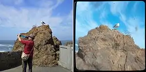 Through the Viewfinder (TtV) photography is a photographic or videographic technique in which a photograph or video or motion picture film is shot with one camera through the viewfinder of a second camera. The viewfinder thus acts as a kind of lens filter.[1][2][3] The most popular method involves using a digital camera as the image taking camera and an intact twin-lens reflex camera (TLR) or pseudo-TLR as the "viewfinder" camera.[4] TLRs typically have square waist-level viewfinders, with the viewfinder plane at 90 degrees to the image plane. The image in a TLR viewfinder is laterally reversed, i.e. it is a mirror image. Most photographers use a cardboard tube or other apparatus connecting the two cameras in order to eliminate stray light and prevent reflections from appearing on the viewfinder glass or on the lens of the imaging camera.