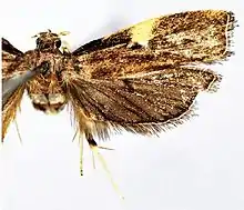 The wingspan is 20.5–21 mm. The head of the adult is grayish brown, with grayish white scales around the eyes. The antennae are yellowish white and longer than the forewing. The forewings are rectangular, with the costa gently curved and the apex blunt. They have a brown with dark purple color and a grayish black fringe with a yellowish white basal line. The hindwings are grayish brown and the fringe is fawn black, with a yellowish white basal line.