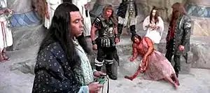 A character of the same name is the main antagonist in the 1982 movie Conan the Barbarian. Played by James Earl Jones, the cinematic Thulsa Doom is considerably different from the literary one, who is described as having a skull-like face. Pre-production drawings showed this version of Thulsa Doom with the skull-like face, but as filmed, he is essentially the classic Conan villain Thoth-Amon, servant of the serpent-god Set.[11] As such, he appears as an ordinary human in the film, though one said to have lived for a thousand years and with the power to transform into an enormous snake. Thulsa Doom received praise for the power and conviction that Jones brought in his portrayal, and he reminded critics of Jim Jones, a cult leader whose hold on his followers was such that hundreds of them obeyed his orders to commit suicide.[12][13]