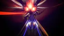 The objective of Thumper is to guide a beetle-like creature along a single or multi-track through a series of unnerving worlds.[1] The player must press a button to hit lit "notes" on the track in time with the background music, while also bracing against obstacles, turning against curved walls, jumping over spikes, and defeating enemies. The game is played in a third-person point of view with an extremely fast scrolling speed.