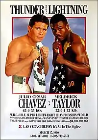 Julio César Chávez vs. Meldrick Taylor, also billed as Thunder Meets Lightning, was a light welterweight world championship bout held on March 17, 1990 between WBC world champion Julio César Chávez of Mexico and IBF world champion Meldrick Taylor of the United States, both at light welterweight, which was a historic event in professional boxing. It was titled "Thunder Meets Lightning" as an allusion to the punching power of Chávez and fast handspeed of Taylor. The fight was expected to be a rousing and exciting one but few, if any, could have foreseen the intense action it would produce, or the lasting fame it would earn in boxing history due to its dramatic and controversial ending that continues to be widely debated to this day. It would later be named The Ring magazine's Fight of the Year for 1990, and later the "Fight of the Decade" for the 1990s.