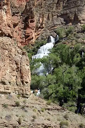 The creek is fed from Thunder Spring, the second-largest spring on the North Rim. Water emerges from the Muav Limestone in a deep cave system at approximately 54 °F (12 °C). Since the spring flows year round, the river is a perennial river.[3][9] In 1970, the spring was estimated to discharge twenty-one million US gal (79,000,000 L; 17,000,000 imp gal) of water per day into the river.[10]