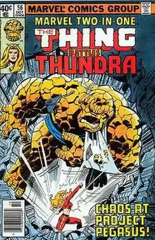 Thundra is also recruited into the evil group of supervillains known as the Frightful Four by the Wizard, and they battled the Fantastic Four.[4] She secretly has her own agenda and has no real interest in the group. She battled the Thing in personal combat, and then wound up ultimately switching sides and helping the Fantastic Four defeat the Frightful Four after she quits that group.[5]