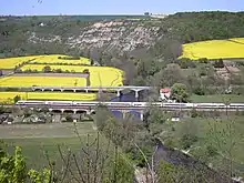 The 32-kilometer Großkorbetha–Saaleck junction section in central Germany (Mitteldeutschland) is very busy as it combines east–west traffic (Dresden–Frankfurt) with north–south traffic (Berlin–Munich). Already in 1937, 30 long-distance trains ran on this section each day, in 1989, there were as many as 37 long-distance trains and there were 35 pairs of trains in 2004. South of Großkorbetha station the line runs near the Saale, crossing it eight times before Saaleck. Next, the line reaches the city of Weißenfels, where a main line branches off to Gera via Zeitz. Until Die Wende there was also a large freight yard with 252 sets of points in Weissenfels; today there are still 12 sets of points and five tracks. The importance of Weissenfels as a railway junction has been reduced with passenger operations based in Naumburg and freight operations based in Großkorbetha. Naumburg is the first town on the line with a stop for long-distance traffic. Southwest of Naumburg, the line passes through the scenic Saale-Unstrut-Triasland nature park, where the Saale valley is lined with vineyards. After the spa town of Bad Kösen, the Saal Railway branches to the south towards Jena, Saalfeld and Munich. Above the Saale valley here are the castles of Saaleck and Rudelsburg. Electric traction was possible on this section for the first time in 1941, but five years later, in 1946, all components of the electrical equipment were removed as reparations to the Soviet Union. In 1965, the line was re-electrified, this time to Neudietendorf.