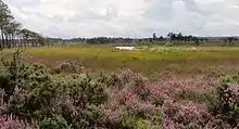 Thursley Common is an area of some 350 hectares of heathland in the southwest of Surrey, England. It is protected as a Site of Special Scientific Interest and as a National nature reserve.[2] Lying between the villages of Thursley and Elstead, the common is generally 2–300 feet above sea-level. The site consists of extensive areas of open dry heathland, with peat bogs, ponds, boggy pools and ditches, and both pine and deciduous woodland. There are sandy tracks and paths, and a "Heath trail" leads from the carpark around a circuit, with boardwalks in boggy areas and with a number of information boards.[3]