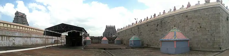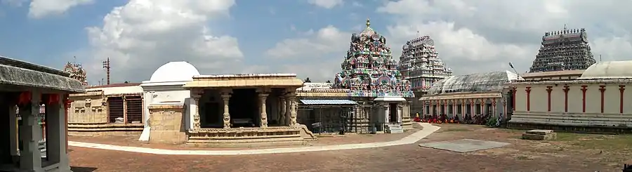 The temple complex occupies an area of around 17 acres (6.9 ha) with the Kamalalayam tank to its west, which occupies the same area. The temple has nine gopurams, 80 vimanas, twelve temple walls, 13 halls, fifteen large temple water bodies, three gardens, and three large precincts. The major gopuram of the temple is seven-tiered and raises to a height of 118 ft (36 m).[15] The two main shrines of the temple are for Vanmikinathar (Shiva) and Thyagarajar. Of the two, the former is the most ancient, and derives its name from tha anthill (putru), which takes the place of linga in the main shrine. Appar, the 7th-century poet saint, refers to the main deity in his hymn as puttritrukondan (one who resides in the ant hill). The Stala vriksham (temple tree) is red patiri (trumpet flower tree). The principles and practises of tree-worship and ophilotary are ancient bases whereupon a later date linga worship seems to have been established.[16]
