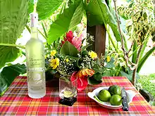 Ti' punch (Haitian Creole: Ti ponch, [ti pɔ̃ʃ]; French: Petit Ponch) literally meaning "small punch", is a rum-based mixed drink that is especially popular in Martinique, Guadeloupe, Haiti, French Guiana, Réunion, and other French-speaking Caribbean islands.[1] It is also the national cocktail of Martinique and Guadeloupe.[2][3] It is very similar to the daiquiri, which is usually identified with Cuba, and the caipirinha, identified with Brazil. A major difference with the daiquiri is that the Ti' punch contains little lime juice; the lime element is mostly zest.
