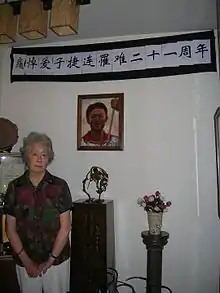 The Tiananmen Mothers (Chinese: 天安门母亲) is a group of Chinese democracy activists promoting a change in the government's position over the 1989 Tiananmen Square protests and massacre. It is led by Ding Zilin, a retired university professor whose teenage son was shot and killed by government troops during the protests. The group – comprising the parents, friends and relatives of victims of the massacre – formed in September 1989 when Ding, along with her husband Jiang Peikun, met another mother, Zhang Xianling, whose 19-year-old son was also killed on June 4, 1989.[1] As well as campaigning, the group also disseminates information about the events to the public, including through the internet.[1] Currently, the group consists of relatives of 125 individuals killed during the protests.[2] For her efforts, Ding has been hailed as an "advocate for the dead".[3]