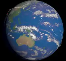 At the request of China and the United Nations Office for Outer Space Affairs (UNOOSA), the Inter-Agency Space Debris Coordination Committee (IADC), led by the European Space Agency (ESA), conducted an international campaign to monitor the re-entry of Tiangong-1. ESA's Space Debris Office in Darmstadt, Germany hosted and administered the campaign, with participation from other space agencies and organizations including the China National Space Administration (CNSA), the Indian Space Research Organisation (ISRO), the Japan Aerospace Exploration Agency (JAXA), the Korea Aerospace Research Institute (KARI), and Roscosmos of Russia.[76] The IADC predicted that Tiangong-1 would break up during re-entry, but that parts of the station would survive and fall to the Earth's surface, potentially falling across an area thousands of kilometres long and tens of kilometres wide. However, because most of the re-entry area was ocean or uninhabited land, the IADC stated that the odds of a person being hit by falling debris to be "10 million times smaller than the yearly chance of being hit by lightning".[72] The IADC's final prediction before re-entry was that Tiangong-1 would re-enter at around 01:00 UTC on 2 April 2018, plus or minus 2 hours, falling somewhere on Earth between 42.8° North and 42.8° South latitudes,[77][78] with the most likely re-entry sites being at the north and south extremes of that range. This is because an inclined orbit has the smallest north-south speed at the extreme latitudes, and the greatest north-south speed near the equator.[72]