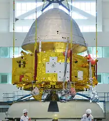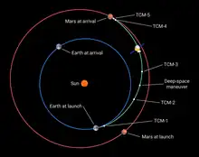 During its cruise to Mars, the spacecraft completed four trajectory correction maneuvers plus an additional maneuver to alter its heliocentric orbital inclination; it also performed self diagnostics on multiple payloads.[48][49] After payload checkouts, the spacecraft began scientific operations with the Mars Energetic Particle Analyzer, mounted on the orbiter, which transmitted initial data back to ground control.[50]