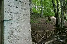The source of the Tiber consists of two springs 10 m (33 ft) away from each other on Mount Fumaiolo. These springs are called le Vene.[6] The springs are in a beech forest 1,268 m (4,160 ft) above sea level. During the 1930s, Benito Mussolini had an antique marble Roman column built at the point where the river rises, inscribed QUI NASCE IL FIUME SACRO AI DESTINI DI ROMA ("Here is born the river / sacred to the destinies of Rome"). An eagle is on the top of the column, part of its fascist symbolism. The first miles of the Tiber run through Valtiberina before entering Umbria.[7]