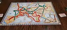 The game ends when one player has only two or fewer of their supply of coloured train pieces. When this occurs, every player then plays one additional turn, after which they each reveal their previously hidden destination tickets.[4] Additional points are awarded for having successfully connected the destinations on the cards, whereas points are subtracted for any incomplete tickets. A ten-point bonus is awarded to the player who has the longest continuously connected set of routes.
