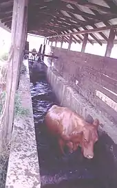 Ticks infesting sheep and cattle have been controlled with a wide variety of chemicals ranging from coal tar extracts, arsenic salts, and specific pesticidal chemicals such as DDT for many decades. These are now replaced by various synthetic chemicals of high specificity for acarines and ticks, and farmers frequently rely on treating their animals with these materials as their default method.[23] However, the expense of labour, equipment and acaricide can sometimes upset a good balance of cost : benefit with conventional treatment methods.[24] Synthetic chemical pesticides specific for ticks (acaricides) are suspended in water for application to the hair coat of domestic animals. Cattle can be immersed in dip-baths containing dipwash, or soaked using a pressurized spray-race made of metal tubing and nozzles. Sheep can be treated in smaller dips or showers. Acaricides can be applied to dogs in watery shampoo formulations. Acaricide active ingredients are usually soluble in oil. This makes them suitable for concentrated oily formulations which spread from a pour-on applicator over the hair coat. Alternatively, some acaricides are incorporated in polyvinylchoride plastic ear tags for cattle, or collars for dogs.[25][26] Modern acaricides belong to the general classes of organophosphates (example chlorfenvinphos), formamidines (example amitraz), synthetic pyrethroids (example flumethrin), phenylpyrazoles (example fipronil), and benzylphenyl ureas (example fluazuron).[2] When correctly applied, they can be highly effective. Problems with acaricides are: danger of acute poisoning of treated animals and human staff; residues contaminating meat and milk; environmental contamination especially water sources; resistance that ticks acquire to acaricides; and cost of application. Cost and contamination can be reduced by seasonal timing of application (strategic treatment) based on ecological knowledge. Prediction of best times for treatment can be made using computerized models of the population dynamics of ticks.[27][28][29]
