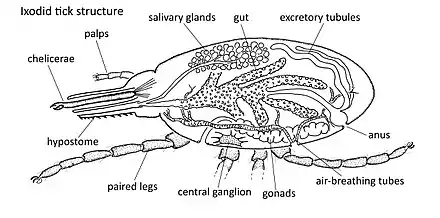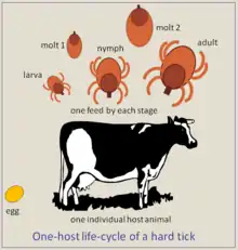 At least some species of ticks have fairly stable populations, with variations in population densities from year to year varying by roughly 10- to 100-fold.[41] The abiotic (environmental) factor that appears to have most influence on tick distribution and abundance is dehydration stress from the combination of high temperatures and low moisture (measured as relative humidity or low saturation deficit, usually resulting from a climate of low rainfall). Computer models to test hypotheses and to predict the distribution of ticks reflect these stresses, using meteorological information where available, or indices of vegetation type as an analogue of temperature and dehydration stress.[42][43] Biotic (host related) factors that influence tick distribution and abundance include the obvious need for the hosts to which the ticks are adapted to be present, and also the defenses that the hosts have against the ticks. During the lifecycle of a three-host tick feeding on its natural host that has acquired immunological resistance to the feeding of the ticks, tick mortality can be high.[44] This mortality is highest for the larvae which are easily killed by the immune reactions in the host's skin. It is lowest in the feeding adults. However, even if the ticks do feed, detach, and moult, the size of newly moulted adults is smaller, and the reproductive capacity of the females is reduced.[45] These biotic factors are likely to produce a pattern of mortality of the ticks that is density-dependent.[43] A high density of ticks attempting to feed induces strong immune resistance in their hosts, but a low density of ticks does not induce such strong resistance.