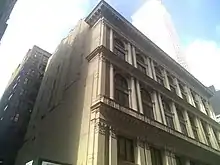 The building's cornerstone was laid on March 16, 1904.[76][77] That month, city inspectors alleged that the Tiffany Building's contractors were violating construction codes by hastily erecting steel frames in the winters and then installing the brick-arched floors in the summers. At the time, New York City law mandated that the top of a development site's steel structure could not progress more than three stories beyond the highest brick-arched floor.[78] The southern lot line, which abutted the home of Henry O. Havemeyer, was originally irregular in shape; this created a situation in which parts of one lot were surrounded on three sides by the other lot. In August 1904, Havemeyer and Tiffany & Co. swapped two of the interior lots to straighten out the boundary of the site.[79] The building ultimately cost $600,000 to complete, excluding the cost of the land.[6] The firm also designed a garage at 141 East 41st Street for Tiffany & Co.[14]