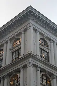 An entablature separated the fourth floor (top of the second tier) and fifth floor (bottom of the third tier). The fifth and sixth stories are designed almost identically to the third and fourth stories, respectively. The main difference is that the engaged piers are covered with panels, and the spandrels of the arches are covered. The facade is topped by an entablature and a cornice with large modillions.[33] Above the cornice, the seventh story is placed within a pitched roof, which due to its location is not easily visible from the street.[32][40][41] The roof appeared to be a tile roof, but it was actually a fireproof metal surface fabricated by the Meurer Brothers.[40]